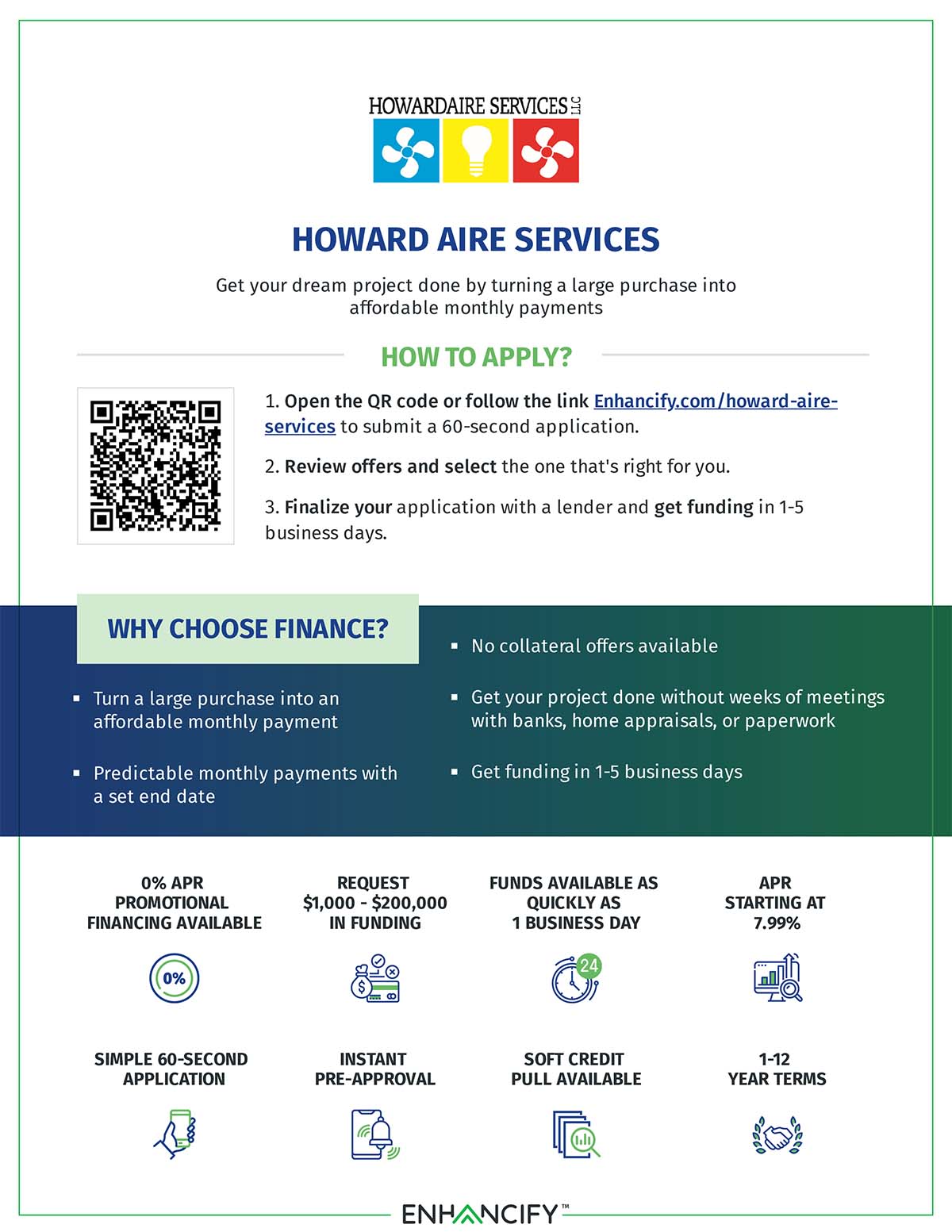 At HowardAire Services, we believe that everyone deserves a comfortable home-no matter the season. That's why we offer flexible financing options to help you get the heating, cooling, or HVAC service you need, when you need it.